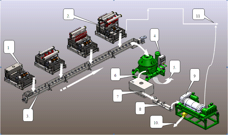該系統(tǒng)的主要模塊有:GN系列鉆屑干燥機(jī)、GN系列高G鉆井液振動篩、GN系列高速變頻鉆井液離心機(jī)、螺旋輸送器等。